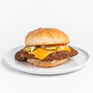 Double Beef Patty mit double irischem Cheddar, homemade spicy Mayo, Gewürzgurken, gewürfelten Zwiebeln und k nackigem Salat auf Potato Bun