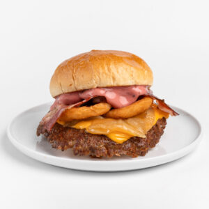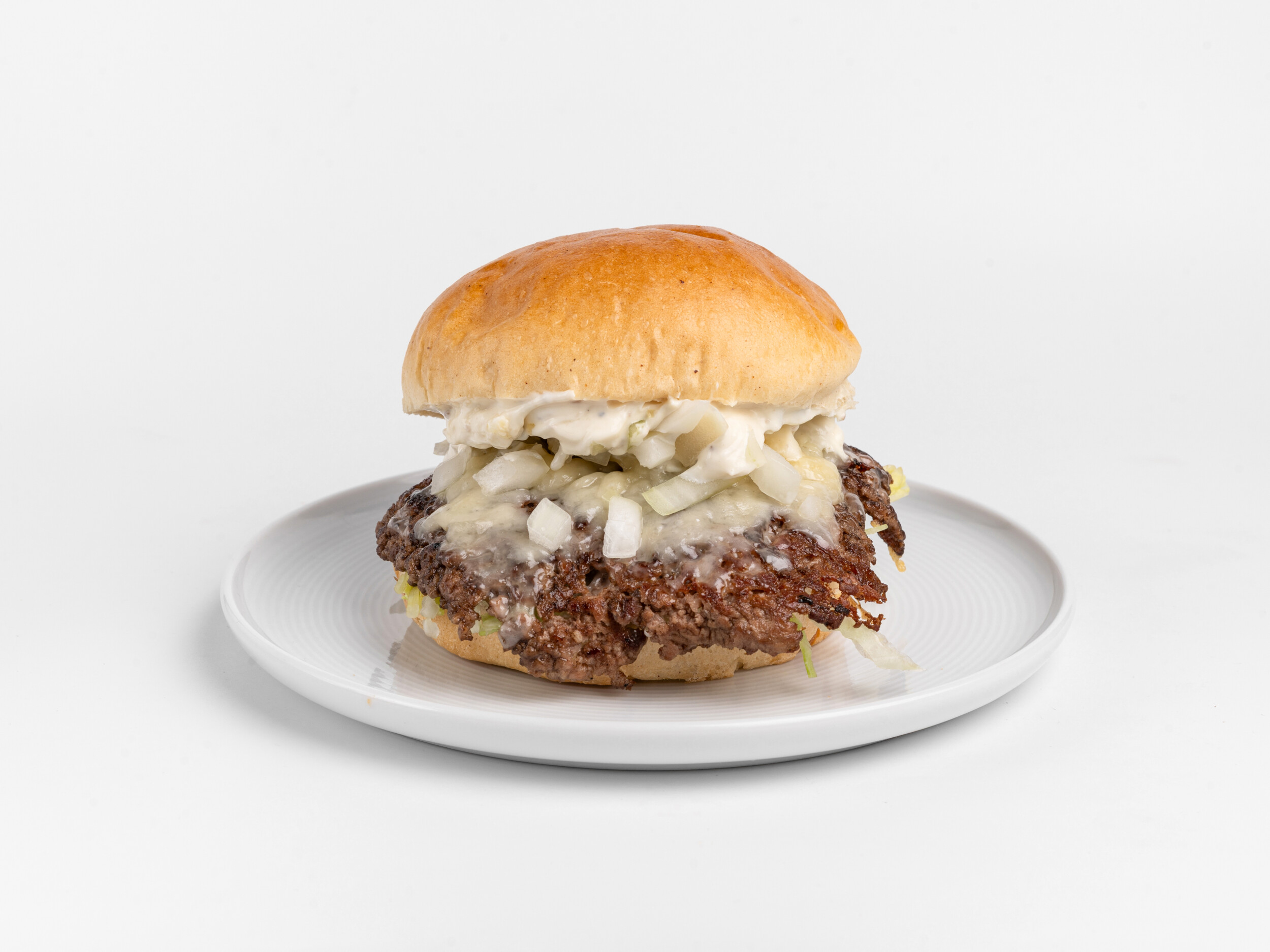 Double Beef Patty mit double irischem Cheddar, homemade spicy Mayo, Gewürzgurken, gewürfelten Zwiebeln und k nackigem Salat auf Potato Bun